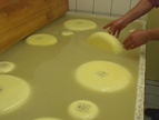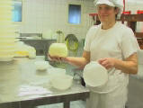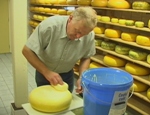 De wrongel, grondstof voor boerenkaas, wordt gesneden,het vocht wordt afgetapt,de wrongel wordt in kaasvaten gevormd tot boerenkaas. In dit kaasvat wordt de wrongel stevig geperst. De kaas wordt daarna gezouten,Dit gebeurt in een pekelbad. Zout is nodig voor de stevigheid, voor de houdbaarheid en natuurlijk voor de smaak van de kaas. De Boerenkaas wordt van een beschermlaagje voorzien om uitdrogen tegen te gaan. Boerenkaas is een ambachtelijk product, toewijding, gevoel voor de kaas en heel schoon werken zijn noodzakelijk voor het verkrijgen van een smakelijke kaas. |